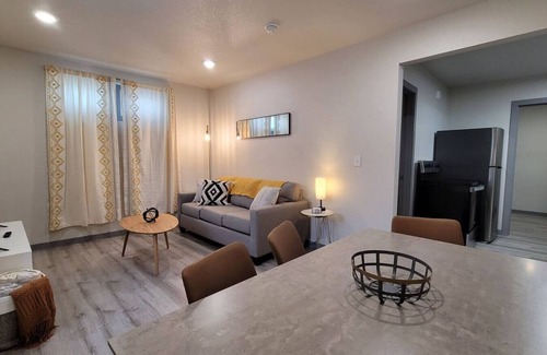 This apartment offers 2 bedrooms, 1 bath, sofa bed, fully equipped kitchen, dining area and gathering space. Perfect for parades on 4th of July and Gold Discovery Days. Free parking and free EV Charging.