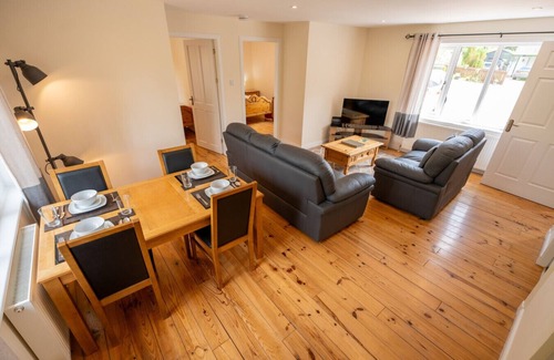 Discover an inviting open-plan layout, where the kitchen, dining, and living areas seamlessly blend together. Unwind in the living area, where two comfortable sofas surround a smart TV, ideal for cosy nights in after exploring the surrounding countryside.