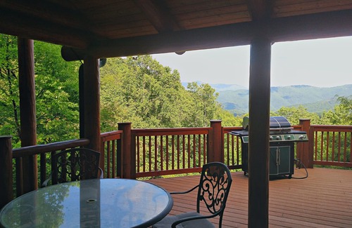 Spectacular, luxury log cabin with fabulous view of Grandfather Mountain and the John's River Gorge. This house is constructed with 10 inch round logs from Montana for that western lodge look. It boasts a huge great room with 25' vaulted ceiling, beautiful stacked stone fireplace, lots of windows, huge deck to enjoy the view, top of the line kitchen, hickory floors, and inviting mountain decor throughout. At 3000 feet, the air is nice and crisp, but air conditioning is available if you need it.