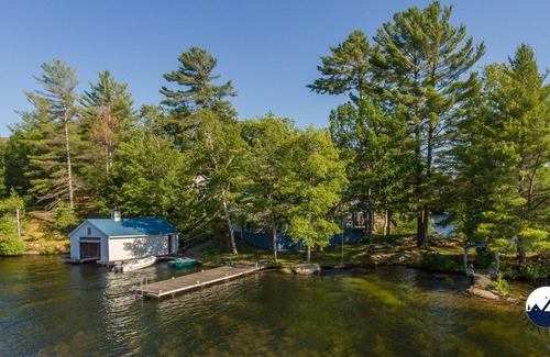 Welcome to Blue Point 3 Bedroom + 1 bedroom Guest cabin is located on 650 Ft shore line is perfect for your family vacation! Located on a beautiful point filled with lush trees this property offers sun all day with multiple exposures making it perfect for everyone. The main offer a cozy living space with plenty of room to entertain and enjoy the views of Little Go Home Bay without the bugs. The kitchen offers all you need to make the perfect dinner for your family at the cottage, sit inside at the 4 person dinning room table or outside at the covered 6 person dining table that offers beautiful views of the lake. The cozy bedrooms offer the perfect space to relax after a long day. Relax in the living room or enjoy a fire after a long day at the shoreline fire pit. Soak in the sun on the spacious dock or use the swim ladder to enjoy the waters below. Soak in this fabulous property with your closest family and friends ! All-day sun and gorgeous sunsets from the deck & dock. This is a one-of-a-kind Muskoka Cottage.