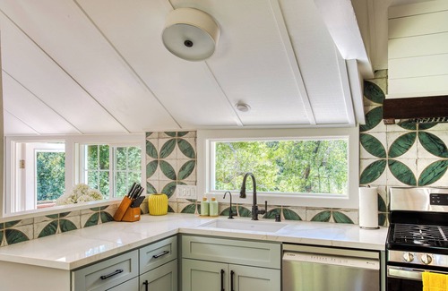 Blue Sky Cottage is one-of-a-kind. It is a lovely, serene cottage on a magical property in an incredible location. The cottage is large at 800 SF, and is freshly renovated head-to-toe. It has a new kitchen, large new bath and much more. Appliances, fixtures, linens, furnishings, cookware etc. are all top quality. The great room, with peaked ceilings, windows all around and skylights, is airy and filled with light. It is serene with soft blue walls and yummy colors, and opens onto a large deck. It has Roku TV with hundreds of channels for streaming, plus books and games. The cottage has its own dedicated network, and Wi-Fi speed is lightning-fast, 782 Mbps, sufficient for high-quality streaming on many devices at once. The kitchen is fully stocked with quality cookware and dishes and has everything you need to cook wonderful meals. Morning coffee is covered with a full coffee station, with Keurig, French press, electric kettle and all the fixings. A mini-split heating and AC system ensure your year-round comfort. The bathroom is newly renovated and just gorgeous, with a double-vanity and a tub enclosure lined with deep blue tile. The bedroom boasts a beautiful queen-sized solid acacia bed with premium Sealy Posturepedic mattress. It has large windows and lovely light, with shades. There is a very comfortable American Leather queen sleeper sofa in the living room. Linens and pillows are good quality throughout. We take sleep quality seriously here! Designed by the owner, an artist, the cottage sings with color - from the sky blue exterior to the sunshine yellow front door to the lively kitchen tiles. Overall the cottage is fresh, chic, peaceful with a cheerful vibe.