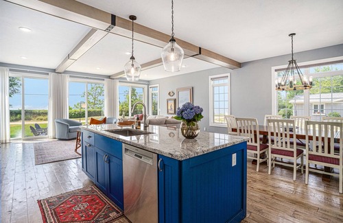 The modern and spacious kitchen at Blueberry Bluff is a chef's dream, designed to cater to both culinary enthusiasts and casual cooks alike. It features high-end appliances, including a professional-grade stove, a large refrigerator, and a sleek dishwasher, all seamlessly integrated into contemporary cabinetry with elegant granite countertops. A standout feature is the convenient dumbwaiter, which ascends to the second-level dining deck, making outdoor dining a breeze. The adjacent dining room is generously sized, with ample space for family gatherings and entertaining guests. A large, elegant dining table anchors the room, surrounded by comfortable chairs that invite long, leisurely meals. With tasteful lighting and beautiful decor, this welcoming space is perfect for both intimate dinners and festive celebrations, ensuring every meal is a memorable experience.