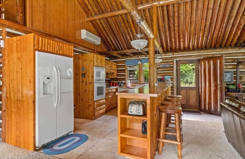 As you come up the driveway you are immediately greeted by large trees and a view of the river along the house. Our home sits on a bend, allowing for the river to flow on either side of the home. Stepping inside the high ceiling and original log cabin walls will stun your eyes, they are so charming! Our uniquely styled house has a large fireplace with pudding stones and Petoskey stones set along each side. The living room is spacious and bright, with a great view of the forest and river and plenty of space for your friends and family to gather. The kitchen is straight ahead to your right as you walk in, fully equipped with anything you may need during your stay just behind the living room. Windows surround the house allowing bright natural light to soak the cabin walls, it truly feels magical.
