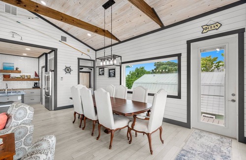 The second story has everything you need for a comfortable stay! There is a full kitchen with appliances, cookware, dinnerware, and utensils. The kitchen island offers barstool seating and a central gathering place for entertaining. There is also a reverse osmosis water spigot for fresh drinking water. The living room features a large TV and relaxing atmosphere. The dining room seats 8 with a beautiful wooden table and large dining chairs. Off of the main area, there are two bedrooms featuring king size beds and en-suite bathrooms for your comfort and privacy. Both bedrooms are bright and open with views of the river. There is also a full-size washer and dryer in the second bedroom upstairs. Plus, the porch upstairs has comfortable seating for you to enjoy the sunshine and the breeze.