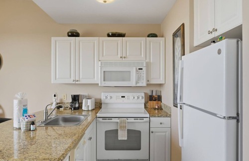 The fully equipped kitchen includes granite countertops, full-size appliances, and all the essentials to whip up your favorite meals. Enjoy breakfast at the granite bar or dine with a view at the cozy glass-top table overlooking the bay.