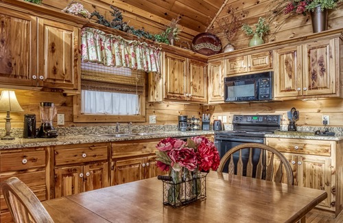 Welcome to Body & Soul! Relax at the very top of Black Bear Falls Resort and marvel at the sensational views of Mt. Leconte and the Great Smoky Mountain Range. Enjoy this expanded one bedroom log cabin loaded with every amenity you could desire. Relax in the bubbling hot tub with privacy screen while enjoying the panoramic views from the front deck. Curl up on the cozy leather recliner in front of a large fireplace while watching the Flat panel LCD TV. You will never want to leave the absolute comfort of the Master Bedroom! The Amish-made King bed with its sumptuous pillow-top mattress and plush bedding will warm you while you watch the wall mounted flat panel TV with DVD and expanded cable. Sink yourself in the master Jacuzzi located in the open master bath adjoining the bedroom. Custom Cedar cabinets invite gourmet meals for two in this well equipped kitchen. Our loft game room is comfortable and fun with its solid slate-top pool table and aspen wood bistro set for two. Other amenities in this fabulous getaway include WIFI, an extra full bath upstairs & stackable washer/dryer. Be our guest and enjoy our lover’s getaway – it will refresh you Body & Soul!