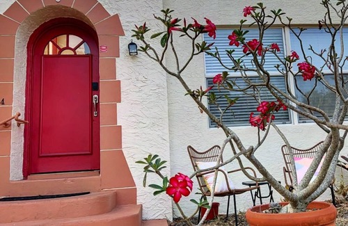 A service fee and the required Brevard County resort/sales taxes are charged on top of the nightly rate. The exterior of the building is monitored by 24-hour surveillance – which we’ve never had to use – but adds an extra level of security. There is a train that runs through downtown Melbourne and can be heard in the late evening and early morning hours. A floor fan is available in the unit if white noise is needed for light sleepers. There are four one-bedroom units in the building; you may occasionally hear other guests. Although only a couple blocks from downtown, the street is residential, so please respect quiet hours. Off-street parking for one vehicle/unit behind the house is available. Beware, the archway over the driveway is narrow. A van or SUV is fine but please go very slowly under the archway; you may need to fold in the mirrors. Additional street parking for a second vehicle or larger trucks/vans is available on the other side of the street.