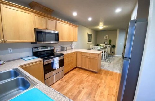 This beautifully furnished and spacious condo offers a perfect blend of modern amenities and cozy comforts. It's an ideal home away from home for families, groups of friends, or business travelers looking to experience the best of Boise. The home boasts a comfortable charm, with 3BD and 3 full BA, with 4 beds! No one has to share! The downstairs bedroom has two twin beds. Upstairs, you'll find two more bedrooms. Each of them have a queen bed with large private walk-in full bathroom attached. The master bathroom has duel sinks and large walk-in closet. The second bedroom with a queen bed has an adorable window bench.