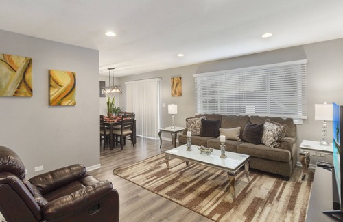 1400 SF renovated unit is 10 minutes from downtown Naperville! This property has 3 bedrooms, & 2 bathrooms. Master suite has a KING, and 2 bedrooms have a Queen. The living room has room for 1 air mattress (Total of 4 beds). Plenty of Kitchen utensils, all you need in a kitchen, including cooking spices and oils! Children friendly & lots of technology!