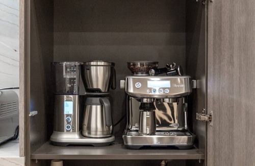 An impressive entrance gives way to a great room that encompasses the main living and dining areas, all open to the contemporary kitchen with chef-grade appliances, imported stone surfaces, and a separate pantry. A capacious sofa faces a crisp fireplace and large TV. The tea/coffee station is fully equipped with a brand-new Breville coffee machine.
