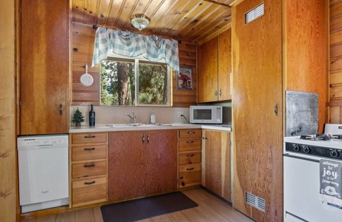 Enjoy this relaxed, romantic setting with outdoor seating and dining on a wood deck with peek-a-boo views of the lake. Floor to ceiling wood interiors with cozy, comfortable, and new furniture throughout the home. This home is perfect for a couples` getaway, or for a small family to enjoy some quiet time in the mountains.Just a short walk to Boulder Bay and the beautiful park with stunning views of Big Bear Lake. “
