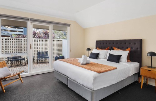 This lovely home is spread over two levels. The ground level offers open plan living with a large TV and gas fire. The master bedroom has a luxuriously comfortable king size bed, walk in robe and ensuite. The large kitchen and dining areas at the rear of the home open out to a private charming courtyard. The upper level has a central bathroom with a bedroom either side. The front bedroom has a comfy queen bed while the back bedroom offers a flexible bedding option, being either a king bed or 2 singles. This room also opens out to a terraced area.