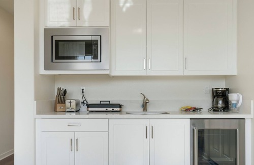 Nothing compares to the serene comfort of a brand-new home. Step into this cozy Casita and discover a well-appointed living space, kitchenette, full bedroom and bath, laundry closet, and a separate entrance. The living space features stunning wood floors and a brilliantly designed layout that caters to all your needs. The kitchenette is equipped with essential amenities, including a microwave, induction cooktops, and a high-end KitchenAid Dual Zone Beverage Cooler with Wood-Front Racks. It also features new Venatino quartz countertops, adding a touch of elegance and sophistication to the space. It's the perfect spot for enjoying meals and drinks.