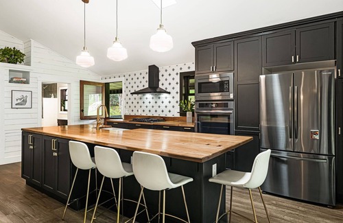 The kitchen countertops, crafted from maple trees harvested directly from the land, serve as a functional and beautiful centerpiece.