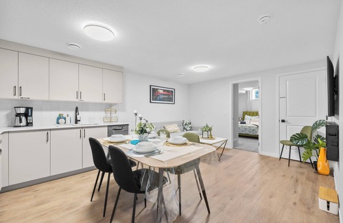 Welcome to your home away from home in Calgary’s stunning northwest! This brand-new legal 2-bedroom suite offers a cozy yet modern retreat for couples, families, business travelers, or friends visiting the city. With a king-sized bed in one room and a queen-sized bed in the other, the suite comfortably accommodate up to 4 guests. Start your mornings with freshly brewed coffee in the fully equipped kitchen, enjoy breakfast at the spacious dining table, and unwind in the cozy living room after a day of sightseeing.