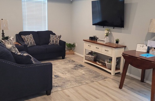 The home is peaceful with all the relaxing amenities needed for a wonderful stay. Beautiful kitchen with spacious bedrooms which have television sets in each. Living area is comfortable and restful. Downtown is just a fun walk away.
