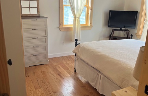 Inside there are two guest rooms downstairs, with a full shared bath, as well as a primary bedroom upstairs with a large ensuite bathroom with a beam framed shower. All the bedrooms have brand-new queen-size beds. The kitchen is open to enjoy guests while cooking up a lovely meal. The dining table is a solid oak piece I got from my builder—a homemade table like many you will find in the house. If it’s cold outside enjoy the wood burning stove which warms the whole house. The large wrap around deck with gas grill and picnic table is where most people want to be when the weather is warm!