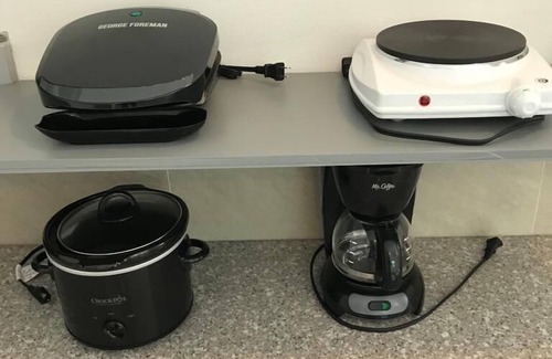 Furthermore, the rooms have air conditioning units and ceiling fans, a fully functional small kitchen with a mini-fridge/freezer, a coffee maker, and a small stovetop. Additionally, the rooms have a safe, Wi-Fi, a spacious closet, and an en-suite bathroom with hot and cold shower, along with clean towels.