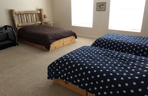 This 6,000 square foot, two-story lodge features two fully-equipped kitchens, a great room, a recreation room, seven bathrooms, and six bedrooms with a total of twelve beds. Extra features include a huge fireplace, wet bar, two TVs, wireless internet, gas barbecue, a steam room, fire pit, tree fort, pool table, foosball, dart board, table games, puzzles, and books.