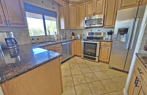 Breathtaking views await you at this peaceful home in Tucson, Arizona. The whole home is yours for you to relax and refresh yourself. This home features premium updates in the kitchen and bathrooms, three bedrooms, two bathrooms, a large backyard, and an attached two car garage. There is a 30 night minimum stay in this quiet neighborhood. One bedroom has been converted into a workspace, which has a desk and futon. Book now, you'll love this home!