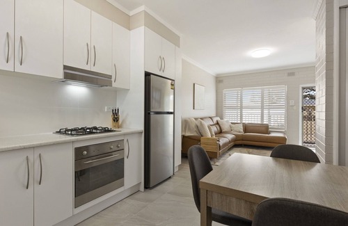 Step into a welcoming space infused with beachside charm and thoughtful comfort. The apartment opens into a tiled living area with a plush 4-seater couch with chaise, stylish rug, and wall-mounted TV offering Free-to-Air channels and streaming access. Two serene bedrooms offer one queen and two single beds, each fitted with plantation shutters, soft bedding, and bedside lighting. The single bathroom includes walk-in shower and essential amenities, a hairdryer, and vanity storage space. In the fully equipped kitchen, guests will find modern appliances including a gas stovetop, electric oven, microwave, and coffee machine. The dining area comfortably seats four, creating a lovely setting for shared meals. A private, separate European laundry with washing machine and clothes dryer ensures extended stays are a breeze. Outdoors, a secure undercover park and enter through a private pedestrian gate. The home apartment is fitted with air conditioning and heating in the living area for year-round comfort. Just a short walk from the beach and vibrant local spots, this apartment blends convenience with style for the perfect beachside retreat.