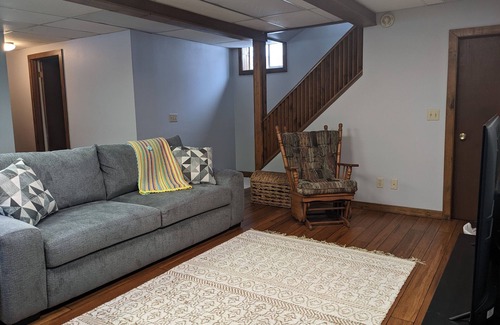 Beautifully and cozily renovated three bedroom, two story house. Master (king) and second bedroom (twin + full bunk) are upstairs with a shared bathroom. Ground floor has a living room and office space, full featured kitchen and dining room. There is also a front porch and a large deck and fenced backyard. The basement has a second living room, a bathroom and a bedroom with a queen.