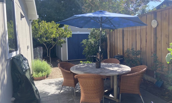 Brand new owner-designed retirement casita with lovely details, natural wood, flower gardens, rarely available to rent. Walking distance to Stanford campus and great restaurants on California Avenue. Light-filled rooms, large private fenced yard separate from main house in front. A dreamy cozy retreat in a safe, walkable, charming friendly neighborhood - College Terrace, right next to Stanford campus. Street parking, bike available to use. Fully stocked kitchen, extra linens.