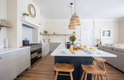 On the ground floor, the kitchen sits at the heart of the action. A huge space with floor-to-ceiling bay windows and patio doors, the room features a relaxing seating area with three sofas, a log burner and a cosy window seat perfect for tackling that to-be-read list. Along with a huge island that can seat 6 at a time, the kitchen area features a dishwasher, oven, hob, wine cooler, small fridge and glorious mountain views.