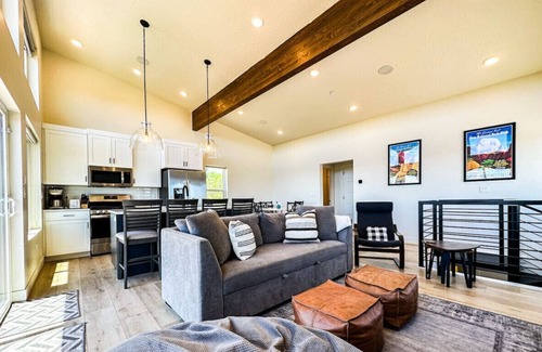 This new, upscale cabin has a simple open floor plan making it feel light, airy, and easy to navigate! You'll enter through the main entrance on the ground level and walk up the spiral staircase that opens into the main living space. You'll be welcomed into the open kitchen/dining/family room with elevated ceilings and large windows looking out toward Bryce Canyon. Enjoy the view from the sleeper sofa or armchair while kicking your feet up and warming up around the fireplace with smart TV mounted above.