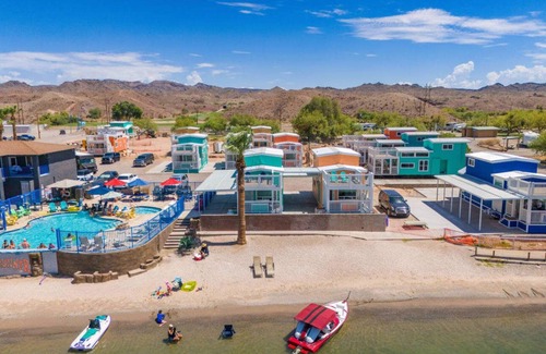 Bubbles & Brews in the Barefoot Beach Club at Roadrunner Resort in Parker, AZ, offers a spacious retreat with two bedrooms, two bathrooms, and two sofa beds. Enjoy a two-story Margarita Deck with stunning Colorado River views. Guests have access to the beach, resort, pool, bar, and restaurant, plus two dedicated parking spots. The resort offers live music every weekend, featuring both DJs and bands. The Barefoot Beach Club is both family & pet friendly! This is a destination you'll remember forever and eagerly return to!