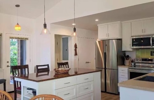 An eclectic mix of antique, exotic, and new furniture gives the home a cozy comfortable feel. A traditional oak table seating 4-6 is easily expanded if you want to have friends or relatives over for dinner. The living room has a sofa lounge, a large book collection, and a 43 inch TV with Roku streaming internet TV programming, and dimmable lighting throughout the home lets you set a mood for most every space.