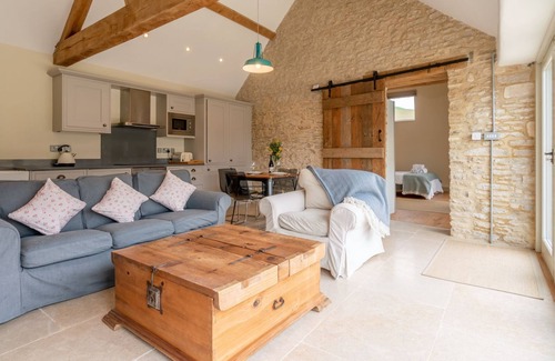 Step through the double, bi-fold doors into the beautiful, open-plan living-dining-kitchen area, with its double-height ceiling, exposed stone walls and original A-frame timbers. Light pours in through the length of this south-east facing room, making it an uplifting space. This lovely retreat's living area is furnished with a smart TV, three-seater sofa, armchair and high-back church pew. The dining area is beside the kitchen and has a square table and four chairs. The fully equipped kitchen runs along the back wall of the barn and features a Carrow Phoenix stone sink, oven/hob, dishwasher, fridge/freezer, microwave, washing machine, Nespresso coffee machine, and all the kitchenware needed to prepare delicious meals.