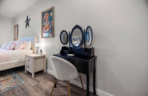 Bungalow 8 is the Glam Room where even the bathroom sparkles! Offers King bed, smart tv, fun pink features and open-concept closet in addition to the standard bungalow features: private furnished patio, keyless entry, kitchenette w/ utensils, dining table, air-fryer micro, full bath, serene countryside views & more! Barndo Bungalows has 9 unique bungalows available for guest stays! Consider staying here during your next Reunion, Bachelor/ Bachelorette weekend, Travel Ball Tourney or Horse event!