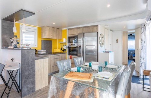 The lodge comprises a living room, a fitted and equipped kitchen, a storeroom, a sleeping area with toilet, a bedroom with two 80cm beds, a bedroom with a 140cm bed, a bedroom with a 160cm bed and storage space.