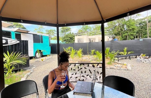 An old bus transformed into an exotic place, with a beautiful private Hot Tube, with an equipped kitchen and very close to Puerto Viejo beach, Cocles, Manzanillo and the entire South Caribbean. We have a very private Jacuzzi that you can use all day and night, it has a hot water shower, air conditioning, a double bed and a double sofa bed. The sounds are strong and become more intense at night, frogs, monkeys, birds, giving a jungle concert for you.
