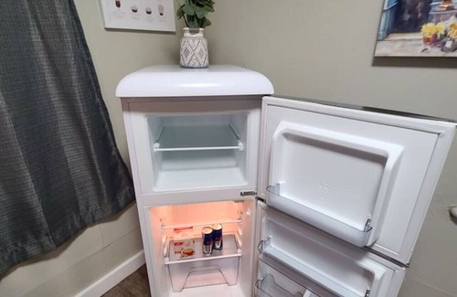 Pets are $20/night PER PET - may be paid on Airbnb or contact us for other method of pymt. Queen bed, 2 barrel chairs, small dining table and stools, large mini-fridge, full sized stove, coffee maker with coffee, creamer, sugar, tea, microwave, dishes, cups and silverware for two. 42" Smart TV, internet, updated bathroom with corner round shower glass enclosure.