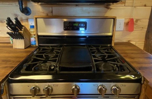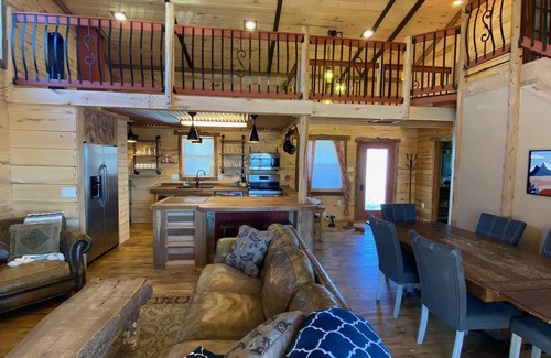 This custom apartment at The Cedaredge Lodge is our crown jewel! It features stunning woodwork throughout, 2 private balconies, a wood stove, a beautiful kitchen and dining area and an upscale bathroom. The upstairs has a king bedroom and a unique catwalk to a loft with two covertable queen chairs. The bedroom on the main floor has two twin beds and plenty of storage space. There is a sofa in the living area.