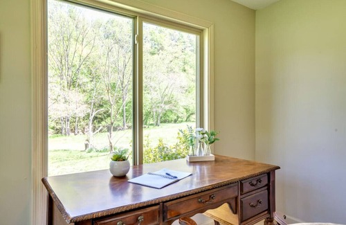Nestled within a stunning farm property, this home boasts a tranquil creek that winds around the grounds, offering serene exploration. Discover remnants of the historic "Roger Mill" and a charming stream meandering alongside the house. Inside, three inviting bedrooms await: one exuding a clean, bright atmosphere with a queen-sized bed, another adorned with a delightful nautical theme and a twin-sized bed, and a third boasting rustic farmhouse-style charm with a full-sized bed. The farmhouse-style master bedroom features an ensuite master bathroom with a spacious vanity, shower/tub combo, and a separate workspace. Additional bathroom amenities include a shower/tub combo and large vanity. The fully equipped kitchen beckons culinary adventures with its amenities, including a stove, microwave, and Keurig. Gather around the six-person dining table for family meals or cozy up in the living room for movie nights. Seek solace in the bright and airy sunroom, where you can enjoy scenic views without sacrificing air conditioning. Outside, indulge in fireside relaxation by the creek or savor grilled delights at the patio station.