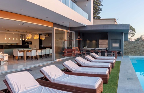 The ultra-modern villa is very spacious, located in a prime hillside location with spectacular panoramic views over the 17 meter infinity pool, Camps Bay and Lion Head. A 4 min walk to beach, restaurants & vibey promenade. Six stunning large ensuite sea facing bedrooms, with balconies, rooftop Jacuzzi. Fantastic large entertainment area with BBQ & Pizza Oven. Full-time Housekeeping included from Mon-Fri, weekends on request.