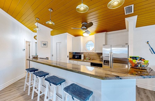 Inside, the air-conditioned open floor plan boasts beautiful coastal decor, vaulted ceilings, and everything you need for a breezy stay! Wind down in the living area and stream your favorite shows on the smart TV with cable, or break out a provided board game for an entertaining evening at home. The well-equipped kitchen features all the major appliances and utensils for creating homemade meals. Coffee enthusiasts will appreciate the Keurig machine.