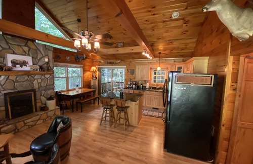 As you walk through the front door of the cabin you will feel at home with comfortable high-end furnishings and rustic decor including an antique hunting rifle, deer mount, local art and authentic Cherokee Indian made bow & arrow quiver. Do you play the guitar? Feel free to strum the Taylor we have for our musical guests. The beautiful gas log Stone fireplace will keep you nice and toasty on a cool night. Flat screen TV with PlayStation 3 / DVD player and DirecTV with NFL Sunday Ticket Max. There is Verizon Business LTE service at the cabin for wireless internet and we have pretty decent cell service.
