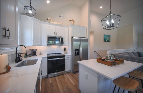 The fully equipped kitchen includes all the essential tools for preparing meals, along with a center island for extra prep space. The dining area offers plenty of seating, and the large sectional sofa in the living room provides the perfect spot to relax after a day in the sun. Each bedroom and the living room are equipped with smart TVs for your entertainment. All bedrooms also feature a sound machine, a fan, and fresh linens to ensure a comfortable night’s sleep.