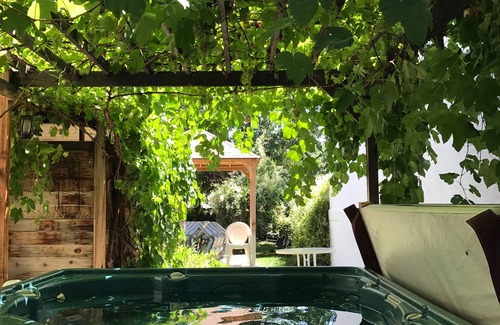 We have a 750sq foot Carriage House that is cute as can be! It has one bedroom with a queen bed, big full kitchen, bathroom with a shower, an up very narrow stairs a tv/sitting room with a couch that can be made into a bed. Cable, WiFi, use of the hot tub on the propert, and a private parking space. We are in the heart of Downtown Montrose just across the street from our local coffee Shop and just a few doors down from the local home/Brew Pub.