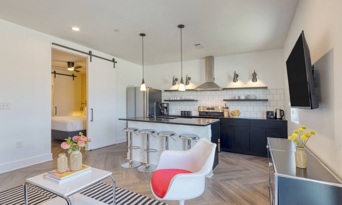 Welcome to The Carter, your one-of-a-kind Nashville getaway. This stylish retreat artfully blends modern design with local charm, highlighted by a stunning hand-painted mural. Enjoy a cocktail on the rooftop, where you'll find breathtaking sunset views over the downtown skyline. Each chic suite includes in-suite laundry, a fully equipped kitchen, and a TV for streaming your favorite shows.