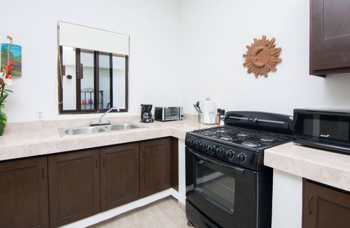 Casa Cascada (waterfall house)Almost one acre of lush tropical gardens, many palms cacti, indigenous plants with fruit and indigenous gardens. Completely private oasis. Newly renovated in 2020. The central feature of the property is a pool waterfall and pool bar. The roof deck of the main house has a fantastic 360 degree view including beach, ocean and one of the best places to watch amazing sunsets! Casita offers 1 bedroom with 2 queen beds and a pull out couch. Full kitchen, living rm. full bath with sundries. LED T.V. Netflix,WIFI.