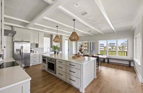 This luxurious 4,000 square feet home can accommodate up to 16 guests – perfect for travelers with discriminating taste looking for a refined, peaceful beach getaway. The open concept living space boasts a spacious living area with plenty of natural light, comfortable seating, contemporary electric fireplace, and large windows showcasing gorgeous beach views. The fully equipped kitchen features stainless steel appliances, double ovens with built-in air fryers, margarita machine, quartz countertops, oversized island & all the necessary cookware for preparing meals. A custom-built dining table and chairs comfortably seats 6, with additional bench seating to accommodate up to 12, plus 5 kitchen island stools. Don’t forget to stock the bar and wine fridge with your favorite beverages! An evening cocktail while enjoying the indoor/outdoor speakers is a perfect way to enjoy the sunset as your day winds down.