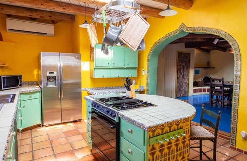 Enjoy a fun stay in Santa Fe at this traditional New Mexico adobe. Tasteful interior, vibrant colors, adobe walls, beams, two fireplaces ($25 cleaning fee/fp applies). In a historic village in the high desert, a 10-mn drive to the Santa Fe Plaza and restaurants, this spacious (1700SF) home can accommodate 4-6 people. High mountains, beautiful desert, clear skies. Tranquil and safe. Casa Azul on other side of house (separate entrance and patio), can be rented along Corazon.