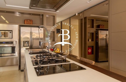 Casa Di Manuele for vacation on Praia de Jurerê Internacional, with the travel agency AEA Boutique Travel, with exquisite and tasteful furniture and decoration, the first floor offers spacious and cozy spaces, its kitchen is complete with top-of-the-line appliances. It is integrated into the dining room.