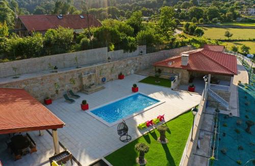 Food & DrinkTea/Coffee makerBathroomBathrobe, Free toiletries, Private bathroom, Bathtub or shower, Toilet paper, Hairdryer, Toilet, Towels, Shower, BathtubMedia & TechnologyTV, Cable channels, Flat-screen TVGeneralIron, Heating, Carbon monoxide sources, Air conditioning, Fire extinguisher, Carbon monoxide detector, Smoke Alarm, Trash cansOutdoorsPrivate pool, Patio, Balcony, TerraceKitchenKitchen, Washing machine, Coffee machine, Microwave, Refrigerator, Dining table, KitchenwareLiving AreaSofa, Fireplace, Dining areaViewMountain view, Pool view, View, Garden viewBuilding CharacteristicsDetachedRoom AmenitiesClothes rackEntertainment & Family ServicesChild safety socket coversPool and SpaPool with a view, Pool towelsBedroomChildrens' cribsSafety featuresAir purifiersCleanliness & disinfectionHand sanitizer |