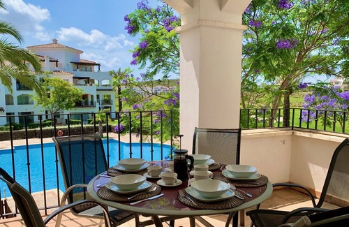 Welcome to our clean, bright and family friendly apartment on the award winning Hacienda Riquelme Golf Resort. The apartment is situated on Calle Indico (see map) and is on the first floor, overlooking a large swimming pool and children’s paddling pool. There is lift access to the first floor. The apartment is nicely furnished with everything you and your family would need to have a fantastic holiday in the sun.